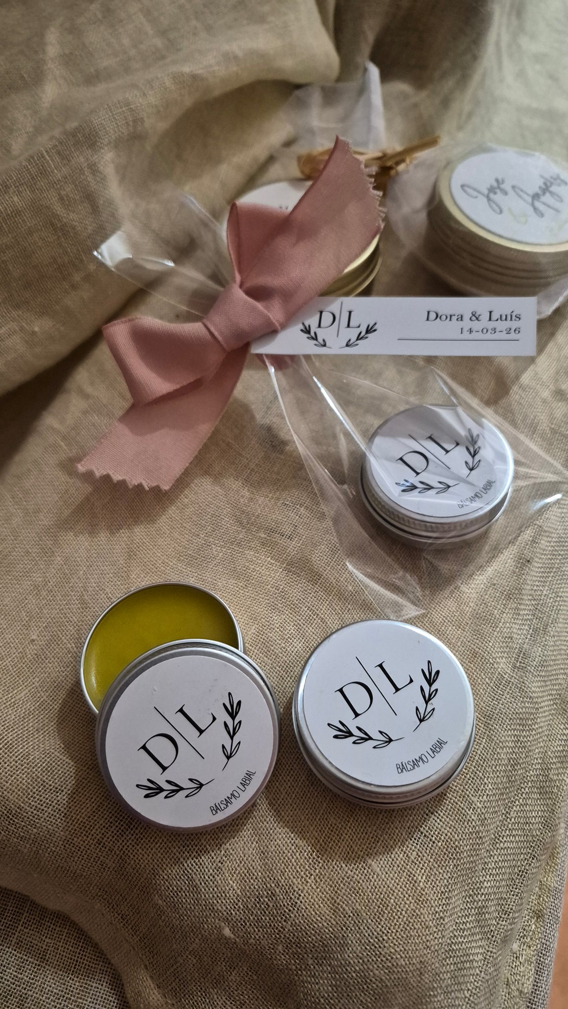 Bálsamo labial de 15ml, protector y reparador de labios resecos y dañados. El precio incluye la etiqueta personalizada, bolsa de celofán, lazo de rafia y paniculata preservada multicolor.
